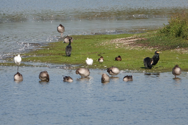 | Bildmitte von links nach rechts: Löffler, Kormoran, Löffler, Pfeifente weiblich, Pfeifente männlich, 2 Kormorane |